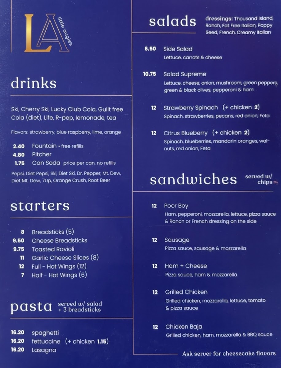 Little Augie's Pizza offers a menu that feels wonderfully approachable, blending classic pizza restaurant fare with a few comforting, casual bites. Whether you’re stopping in for a quick sandwich or settling in for a hearty pasta dish, the menu is designed to complement an easygoing, unpretentious atmosphere.